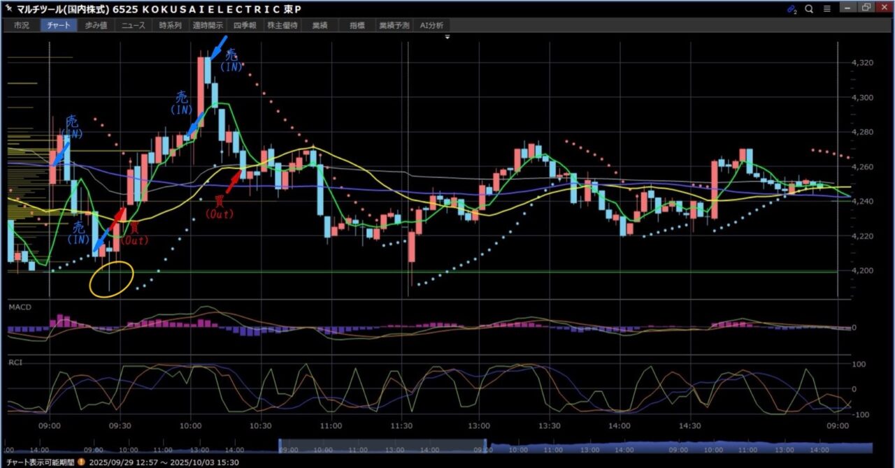 黄色の丸のところ前日の終わり値を割ってそのまま落ちないかなという欲望に目が眩み、せっかくの利益を減らしました…..