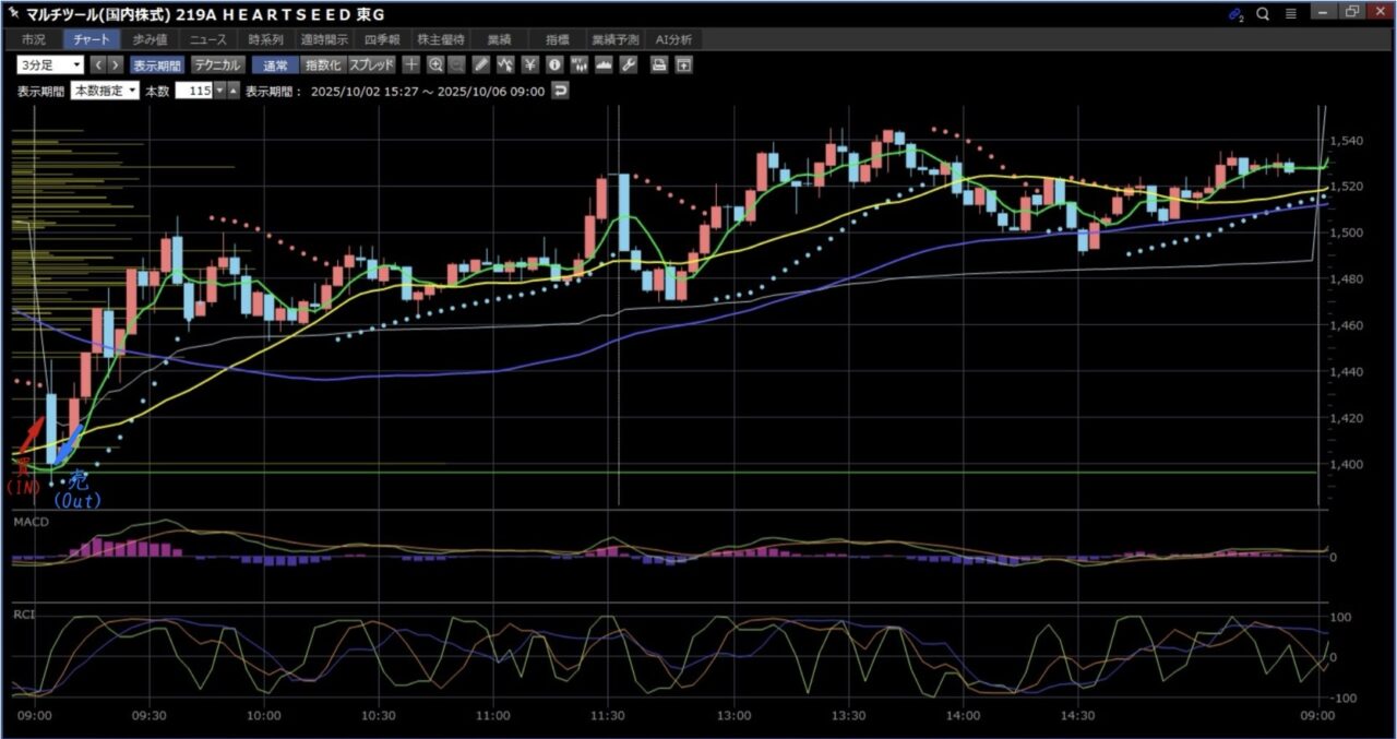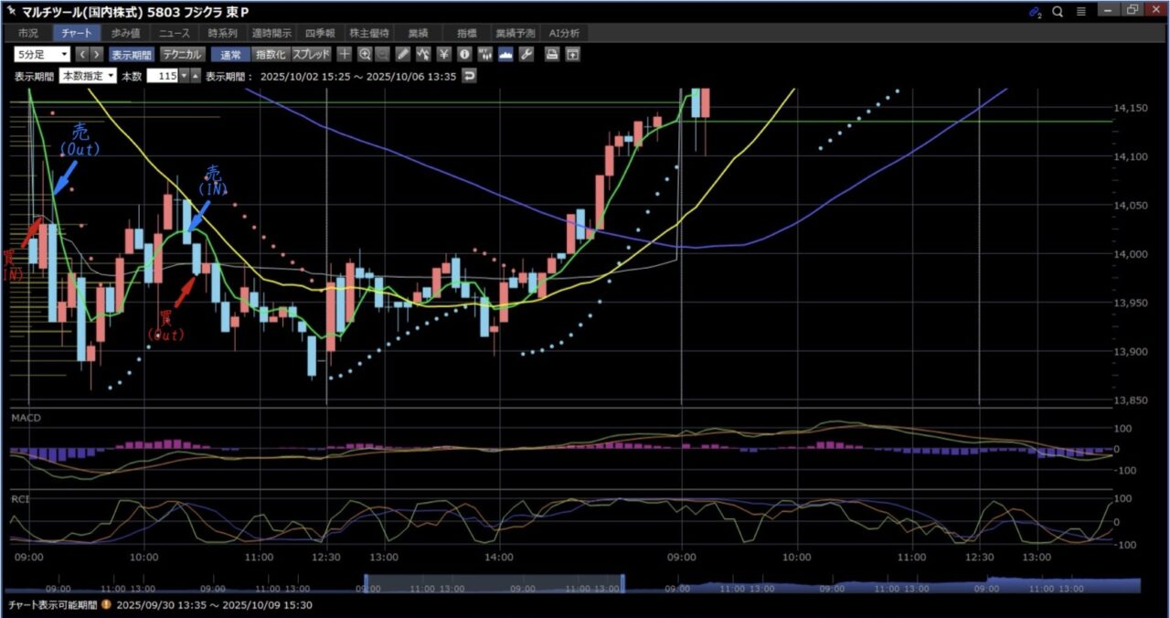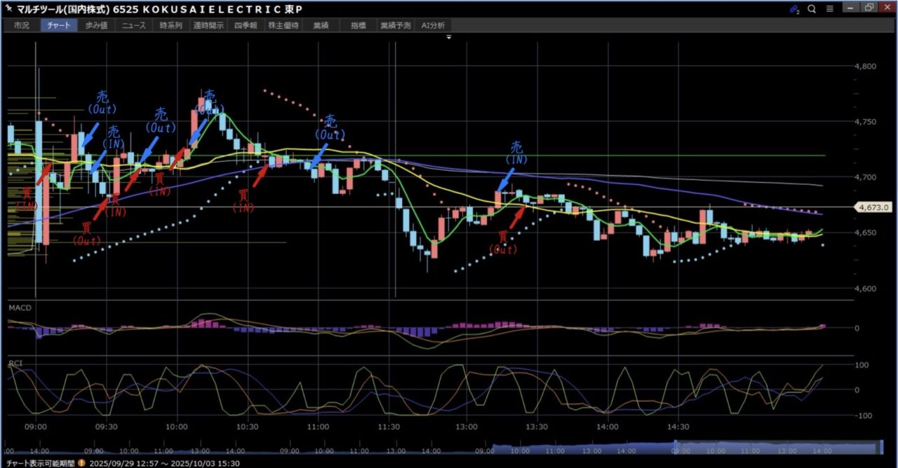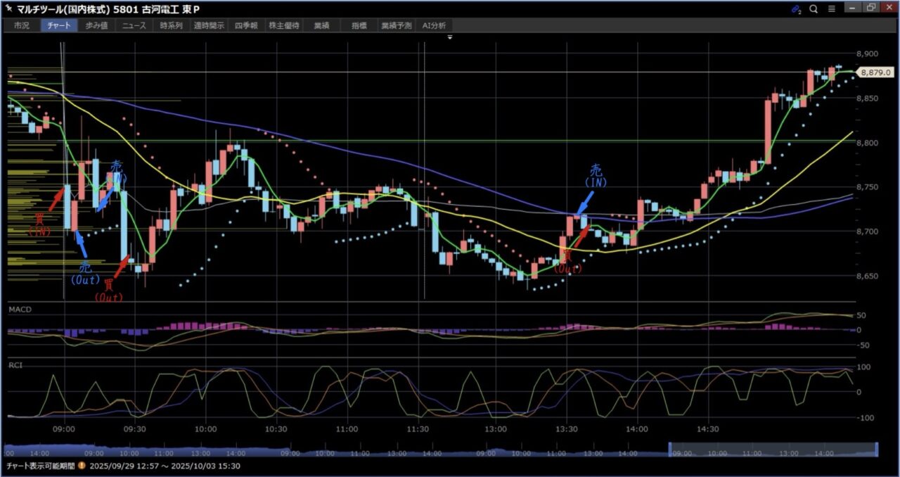 前日から下で寄ったので上がると思い買いでINしましたが、思ったより上がらず損切りした後上がっていきもどかしくなりながらも開始値を抜けれず上髭だったため弱いと思い売りでINできたのはよかったです。