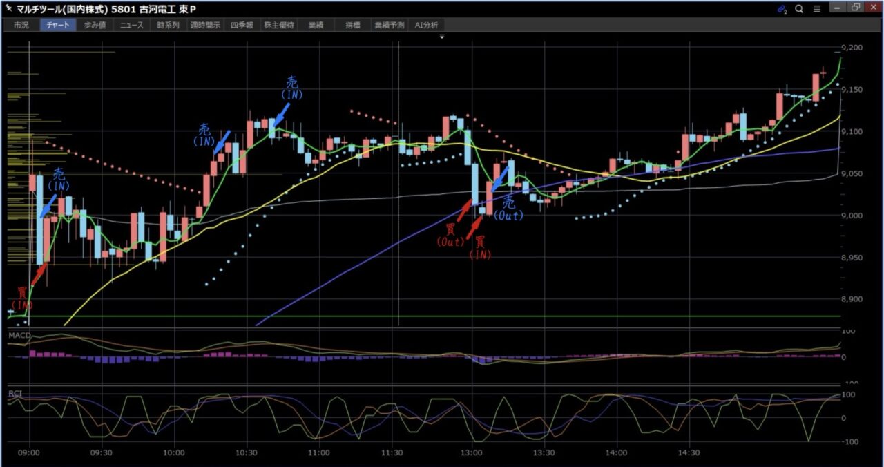 9,067(100株)売り → 9,106(100株)売り増し → 9,039(200株)買埋 +9,500