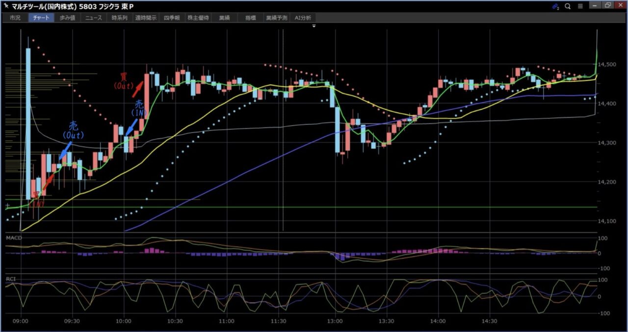 この後の売りはフジクラで負けた分を取り返そうとして大きく張って長時間もってるのでたまたま大きく取れましたが、あまりいいトレードではないです。